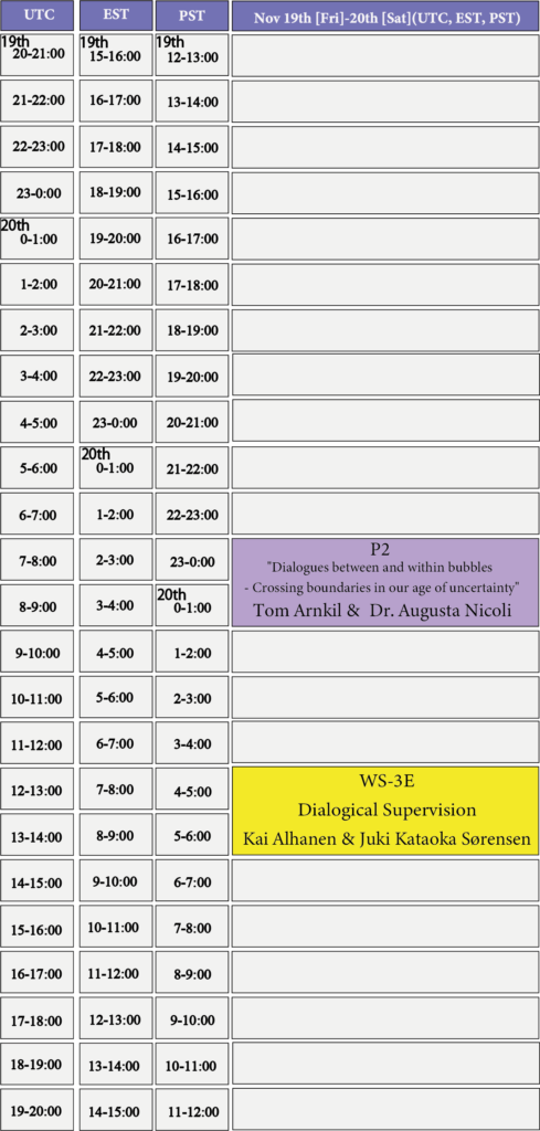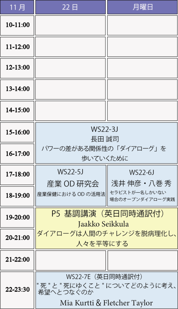 注意1: 最後の「Closing dialogue」の部分に、新たに別のワークショップが加わりましたので、11月22日22時〜24日の箇所をご確認ください。